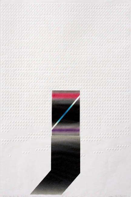 Misternie przygotowane matryce do suchego tłoku, matematycznie wyliczony rytm geometrycznych form tła zderzony z oszczędnym barwnym elementem daje niesłychanie mocną w sile wyrazu, absolutnie przekonywującą kompozycję.