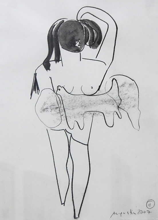 Nie da się przejść obojętnie, widząc wielkie płaszczyzny pokryte bogatym kolorem, gdzieniegdzie spływająca farba, która z zacieku urasta do rangi symbolu, staje się znakiem rozpoznawczym artysty. Mocne, jasne kolory w zestawieniu z ciemnymi, także mocnymi uderzeniami pędzla, pokazują nie tylko kontrast w malarstwie Augustina, malarz uświadamia odbiorcy dualizm życia, jego jasne i ciemne strony, radość i smutek, miłość i gniew. Rysunki artysty są dosłowniejsze w wyrazie, prostsze w konstrukcji i odbiorze. W brutalny sposób wstrząsa widzem, ukazując przemoc człowieka nad człowiekiem. Kadry z obozów koncentracyjnych, postacie krzyczące z bólu, powykręcane, zmaltretowane ciała...wszystko to narysowane mocną kreską, gdzieniegdzie ginącą w głębi tła. W rysunkach, choć bardzo oszczędnych, wprowadza delikatną barwę czerwoną, która symbolizuje fizyczne okaleczenie człowieka - krew. Rzeczywistość, która zrodziła się w wyobraźni Augustina jest zaskakująca, ponieważ w ferii żywych, radosnych barw, widzimy smutek i ból, nie tylko ten bardzo dosadny, fizyczny, ale ten, którego na pierwszy "rzut oka" nie widać - ból duszy.