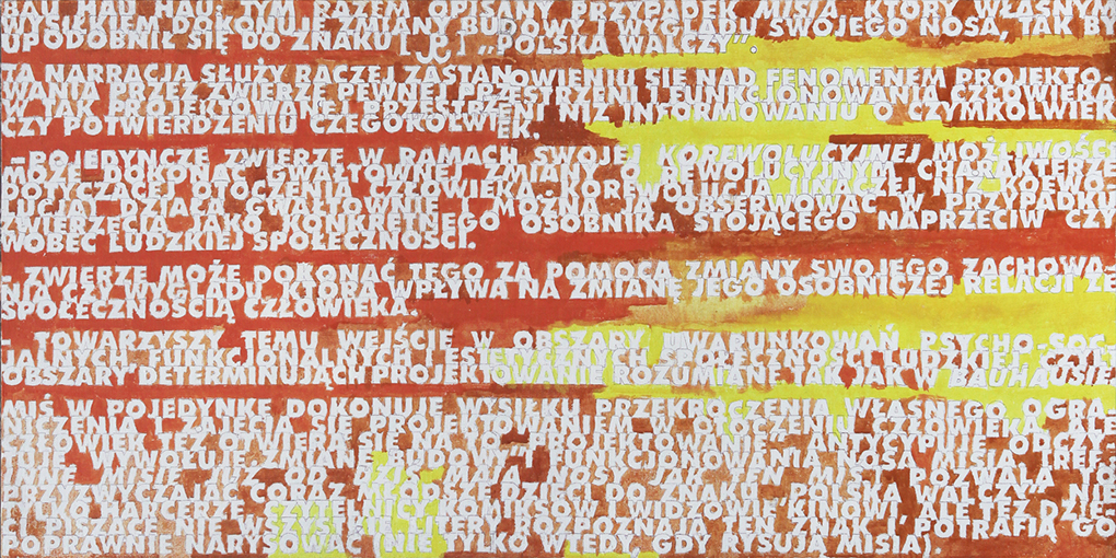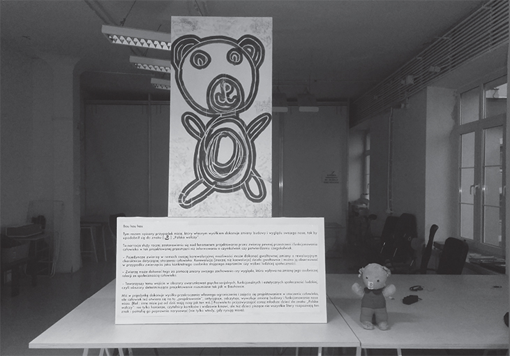 Tak oto Marek Sobczyk opowiada o wystawie, która gości w galerii Milano: Projektowanie przez zwierzęta odbywa się w pewnej przestrzeni uwarunkowań psycho-socjalnych, funkcjonalnych i estetycznych człowieka i dotyczy zagadnień formy i funkcji. Raczej nie mówimy: zwierzę projektuje, ale właśnie szukamy argumentu na rzecz tak pojętej aktywności, która pokazuje w jak ścisłym związku ze zwierzętami jesteśmy, i ile uwagi nam poświęcają. Tworzymy też inną perspektywę w przestrzeni człowiek-zwierzę, perspektywę odważnego, projektującego zwierzęcia.