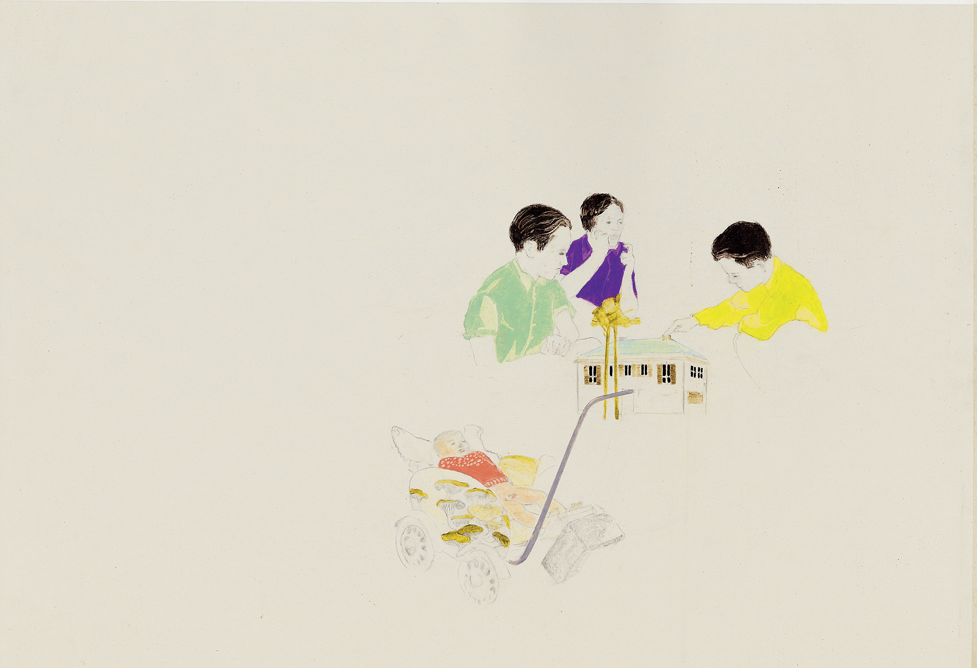 Dwa pastele poznańskiej artystki, pochodzące z 2006 roku, znakomicie puentują ideę naszej wystawy. Topos Budowania Nowego Domu i topos Nowego Człowieka, tak żywotne w tradycji lewicy, w wielowymiarowej przestrzeni Szwed zyskują swoiste znaczenia - oto pięciu Hiramów konstruuje molo, dom na wodzie, a sama idea budowania sprzężona jest nierozłącznie z Nowym Człowiekiem.