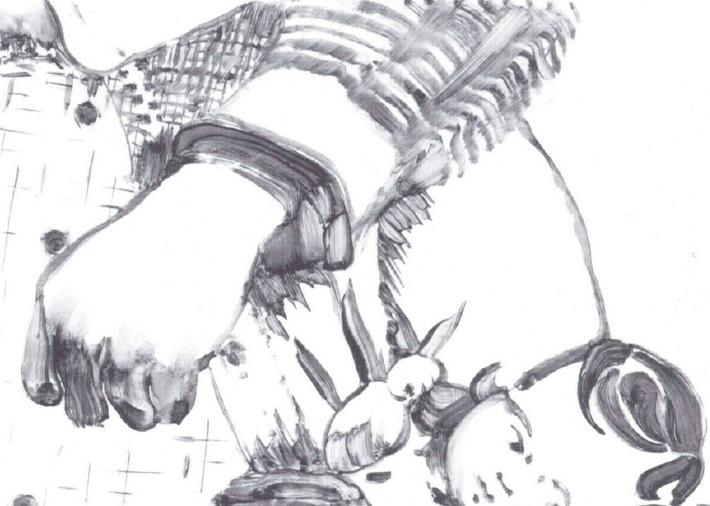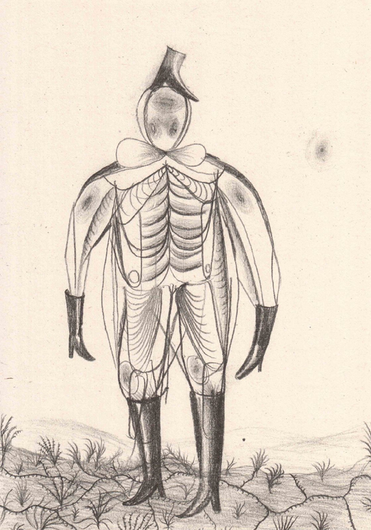 Na wystawie są też rysunki. m.in. Tomka Kowalskiego, którego surrealistyczna postać z butami na nogach i rękach kojarzy się z oficerem z jednego z „Rozstrzelań”.