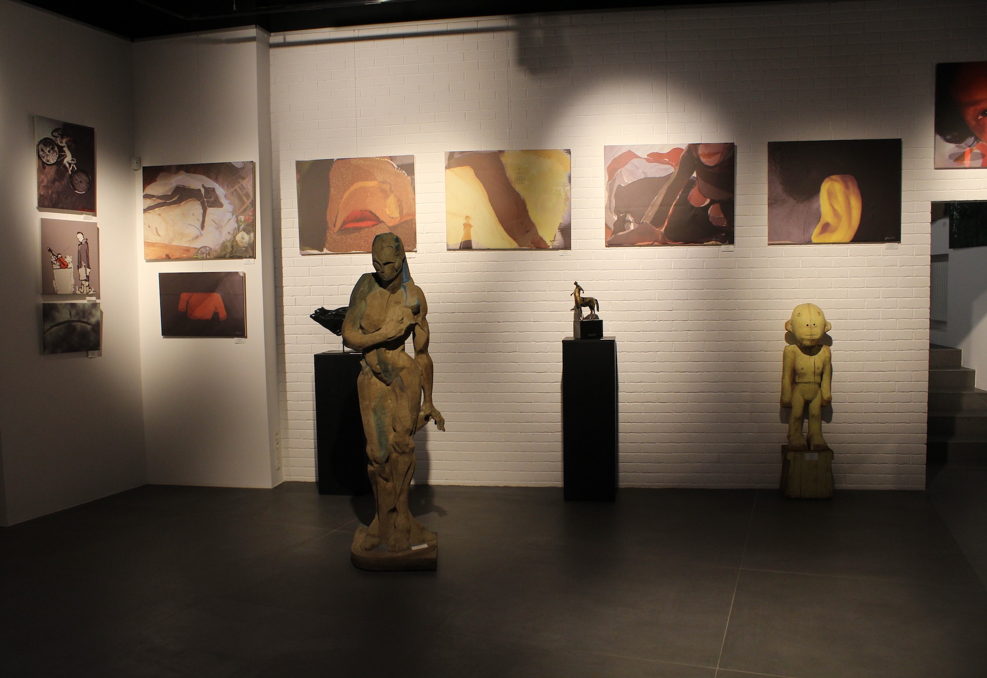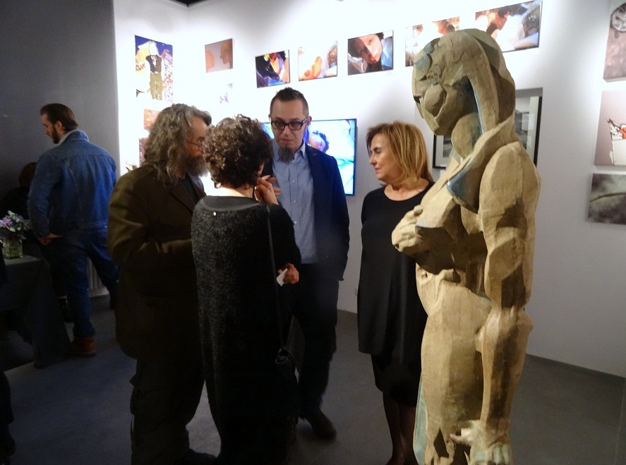 Joanna Szczepkowska wystąpiła w nowej, zaskakującej roli autorki prac plastycznych. Po raz pierwszy zdecydowała się na upublicznienie swoich rysunków w 2000 roku. Wykorzystała je w zbiorze felietonów Drugie podwórko. Delikatne niczym pajęczyna, w sposób aluzyjny odwoływały się do treści poszczególnych tekstów, lub stanowiły rodzaj dyskretnego ozdobnika. Taki był początek artystycznej przygody, która z czasem przerodziła się w autentyczną pasję. Rysunki Joanny Szczepkowskiej przyciągają wzrok wyrafinowaną prostotą i czystością formy. Wizualnie urodziwe, działają na wyobraźnię, prowokują do rozszyfrowania treści zapisanych na nieskazitelnej bieli papieru nieomylną czarną kreską. Nie szuka wielkich tematów, odnajduje je w codzienności. Bohaterami jej rysunków są zwykli ludzie przeżywający swe małe lub wielkie dramaty. Anonimowi przychodnie, w tajemniczy sposób wyróżniający się z tłumu, ludzie z marginesu. Z natury jest ogromnie wrażliwa, przepełniona uczuciem empatii, stąd jej Pijacy i Menele są pełni życia, radośni; nie budzą odrazy, ale sympatię. Niektóre wątki prowokują do kolejnych opracowań. Tak, więc powraca wizerunek bezdomnego skrzypka. Przejmująca w swej wymowie metafora losu zagubionych, zapomnianych artystów… Postacie są zazwyczaj pozbawione atrybutów; autorka wprowadza je, kiedy uzna, że ich obecność buduje dramaturgię. Taką rolę pełni śmietnik, miseczka na jałmużnę i filiżanka stojąca na atrapie kawiarnianego stolika. Większość prezentowanych na wystawie rysunków, ma formę otwartą. Giętka, pewnie prowadzona linia jedynie częściowo wydobywa zarys postaci. Ale potrafi też zapętlić się w miękki celnie zdefiniowany kształt. Spotkamy również przykłady kompozycji budowanych przy użyciu krótkich odcinków pospiesznie położonej ekspresyjnej kreski. Nie budzi zdziwienia fakt, że wszechstronnie uzdolniona i wciąż poszukująca nowych form wypowiedzi autorka, po długim okresie fascynacji rysunkiem, sięgnęła po kolor. Prezentowane na wystawie obrazy zostały zrealizowanie w ciągu trzech minionych lat przy użyciu techniki komputerowej. Graficznie czysty rysunek zastąpiła zróżnicowaną plamą koloru, położonego cienką matową warstwą lub gęstniejącego do emalierskich połysków. Eksperymentuje poszerzając zakres rozwiązań formalnych. Próbuje wypowiedzi w różnych konwencjach. Bywa oszczędna jak w moim ulubionym Swetrze, lub szczelnie na zasadzie horror vacui - zapełnia cały prostokąt kompozycji sylwetkami barwnie ubranych bywalców kawiarni. Znacznie poszerzyła i wzbogaciła zakres inspirujących ją tematów. Zaczyna rozwijać je w cykle. Warto w tym miejscu wspomnieć intrygującą serię prac, do której należy zaliczyć Ciało oraz jego powiększone do nadnaturalnych rozmiarów fragmenty - Usta i Ucho. W szeregu prac wykorzystuje fotografię (m.in. trzy Autoportrety). Wierzę, że zwiedzanie wystawy Joanny Szczepkowskiej było dla Państwa równie fascynującym przeżyciem, jak mój pierwszy kontakt z jej pracami.
