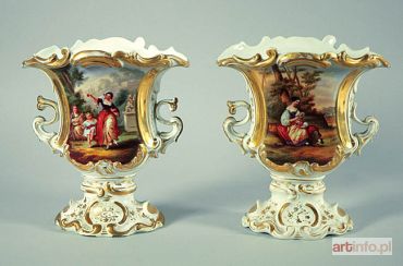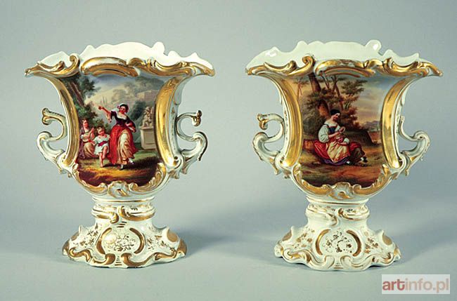 z miniaturami rodzajowymi przyścienne lekko spłaszczone, o rozchylonych brzegach z falistą krawędzią z odcinkowych rocaillów, z plastycznymi esowatymi uchwytami ,z wydzielonymi, puklowanymi stopami; na frontowych ściankach w złoconych plastycznych rezerwach rocaillowych - barwne miniatury rodzajowe w pejzażu z elementami architektury: 1. Matka zakładająca dziecku wianuszek, 2. Nauka tańca (grająca na mandolinie i bosa dziewczynka tańcząca z matką(?); brzegi, stopy, uchwyty, tylne ścianki i krawędzie bogato złocone, m.in. suchych esowatych gałązek i stylizowanej wici kwiatowo-liściastej.