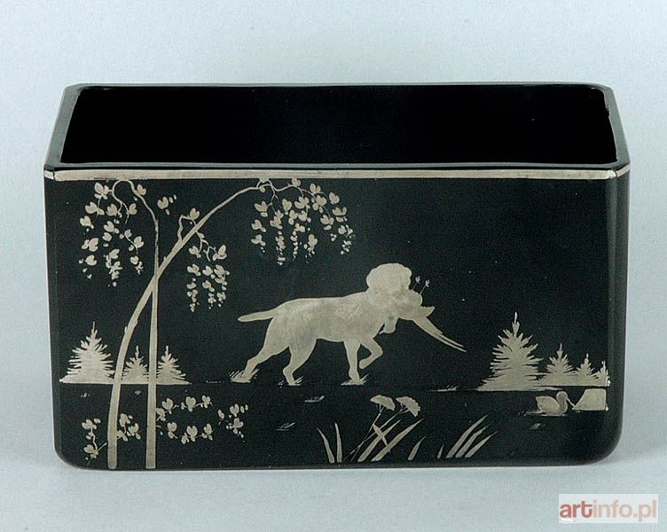 na prostokątnej podstawie, o pionowych bokach, delikatnie ściętych narożach; jeden z dłuższych boków zdobiony sylwetowo srebrem sceną z psem niosącym w pysku upolowanego ptaka na tle pejzażu z mokradłami, górna krawędź srebrzona