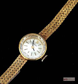 ze złotą, okrągłą kopertą i złotą bransoletką z motywem równoległych pasów warkoczowej plecionki; na tarczy napis: "TISSOT / SWISS MADE"; szkiełko soczewkowe, szlifowane otokowo w trójkąty; mechanizm z napisami: "SEVENTEEN / 17 JEWELS / SWISS / TISSOT / 9168430";