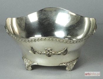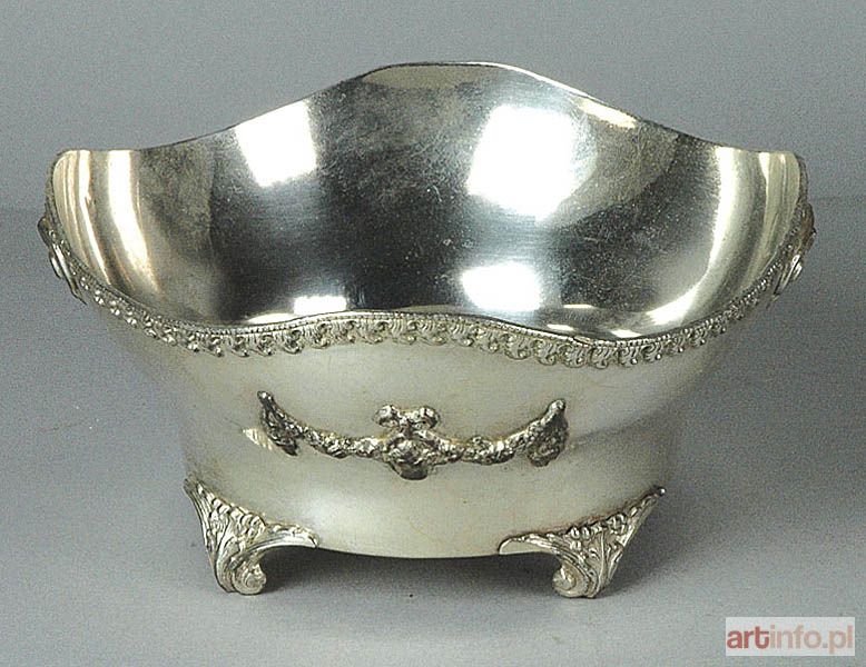 Na 4 nóżkach ozdobionych wolutami, akantem i kwiatami; lustro gładkie, koliste, kołnierz wysoki, lekko odchylony, wykrojony faliście, opasany po stronie zewnętrznej ornamentem małżowinowym; korpus naczynia zdobiony aplikowanymi girlandami i wolutami