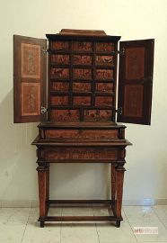 Mebel naśladuje w formie i dekoracji sprzęty wykonywane od pocz. XVI do końca XVII wieku, służące przede wszystkim celom dekoracyjnym i reprezentacyjnym, a także do przechowywania cennych drobiazgów i osobliwości. Mebel kilkakrotnie reperowany, w dużym stopniu rekonstruowany (część szufladek wewnętrznych, listwy profilowe szufladek i płycin drzwiczek, gzymsy, podnóże). Pierwotnie, kabinet przeznaczony był do postawienia na stole lub innym meblu, a zamiast podstawy miał kuliste lub konsolowe nóżki.