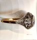 Złoty antyczny pierścionek z dużym okrągłym brylantem w starym szlifie, osadzonym w ażurowej srebrnej oprawie.