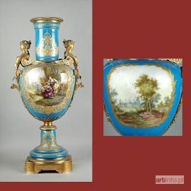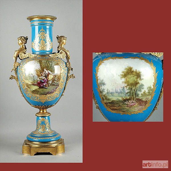 Trzyczęściowy, o owoidalnym brzuścu, cylindrycznej szyjce i kielichowej stopie; brzusiec łączony ze stopą na metalowy trzpień. Turkusowo-niebieski , w odcieniu bleu celeste; w dwu rezerwach na brzuścu, ujętych w wypukłe złocenia roślinnoornamentalne, barwne miniatury: 1) scenka w pejzażu: dwie dziewczyny w strojach stylizowanych na pasterskie, przyglądają się chłopcu, łapiącemu drobne ptaszki w rozpiętą na drążkach siatkę; sygn. u dołu z lewej: Bertran (Bertrand?) ;