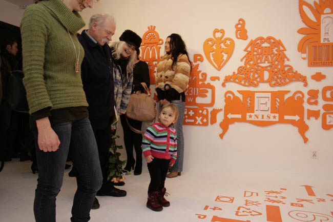 Białe pomieszczenie, wściekle pomarańczowe wlepki na podłodze i ścianie prezentujące znaki ostrzegawcze, które zostały przerobione przez artystę. Bawił się ich formą nadając im często śmieszne znaczenie. Zauważa, że znaki pozbawione oryginalnego kontekstu zatracają znaczenie. Interesuje mnie bardzo materiał, z którego wykonuję prace - folia samoprzylepna, przez którą prace stają się jednorazowe, bo nie można ich wykorzystać ponownie.